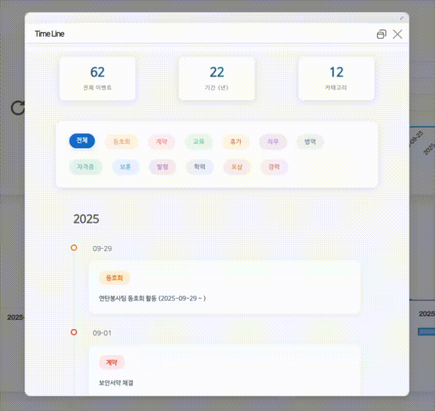 시스템에는 총 61개의 이벤트, 22년간의 기록, 12개의 카테고리가 정리되어 있습니다. 계약, 교육, 휴가, 직무, 병역, 자격증 등 다양한 항목이 시간축에 맞춰 정리되죠.